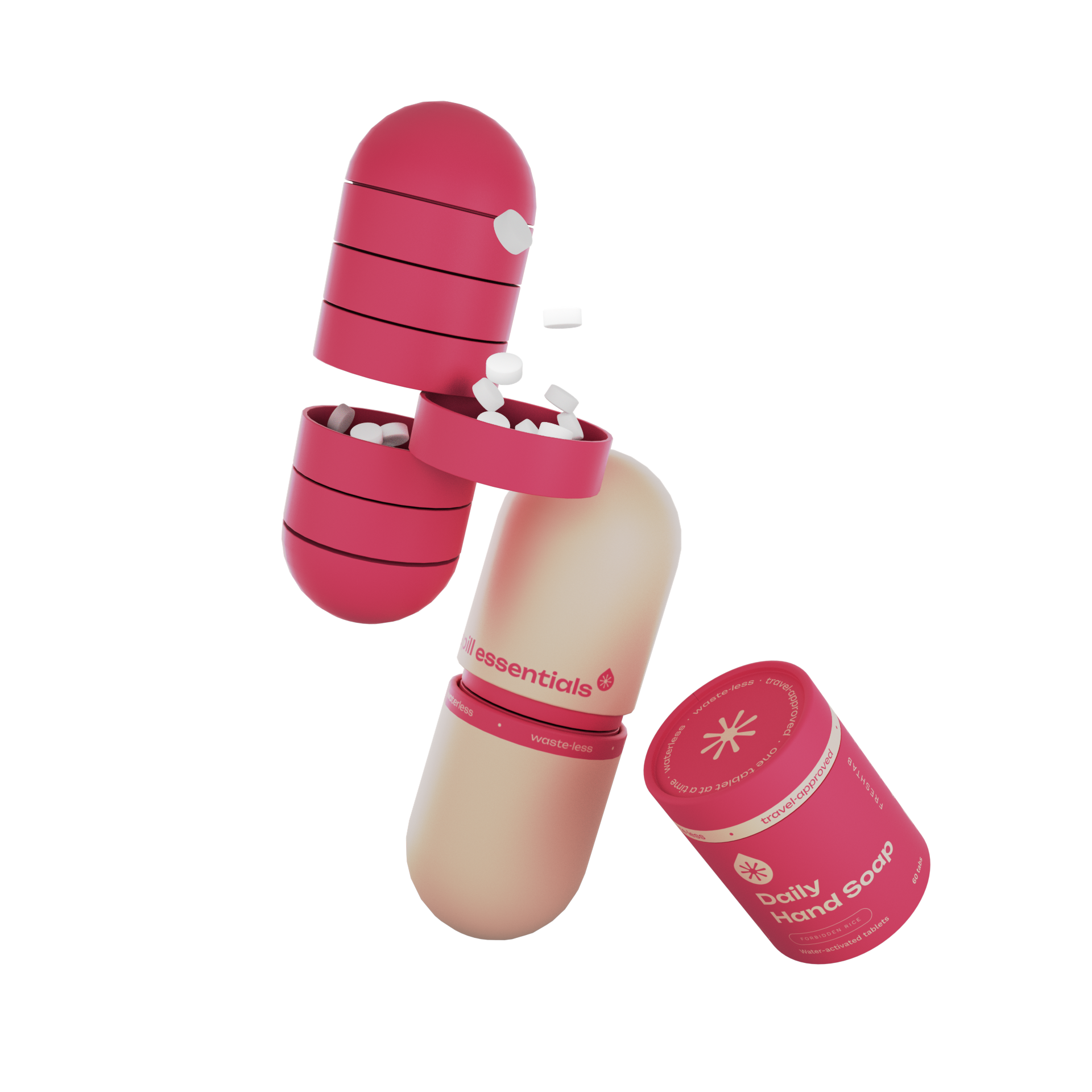 Enjoy your daily skincare routine with our small pills: hand wash, face wash, body wash, shampoo, conditioner, toner, serum, and cream!